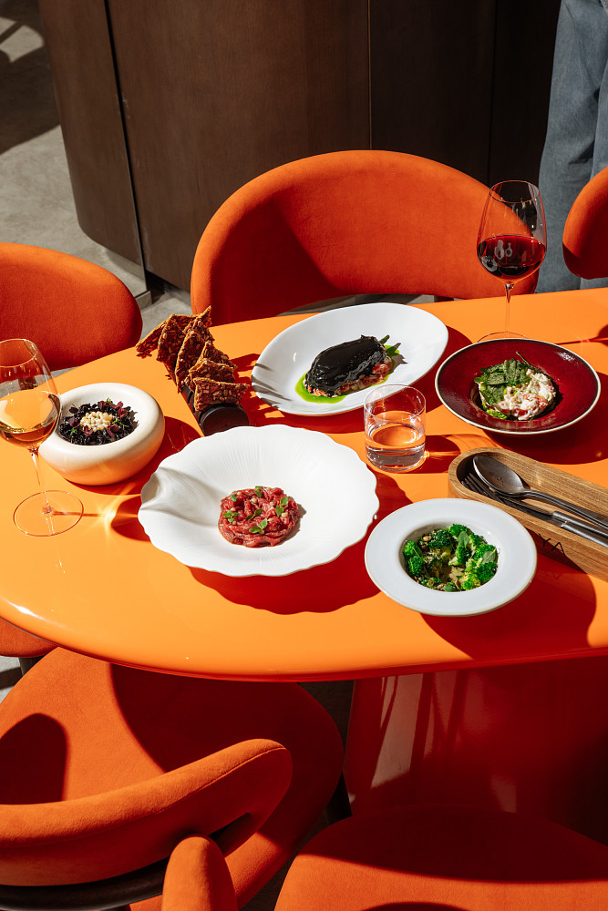 Интерьер под стать философии — вдохновение итальянским футуризмом читается в динамичных формах, холодном бетоне и ритме света, а специально созданная для ресторана посуда соединяет традицию с сегодняшним днем: орнамент на тарелках повторяет кружевной узор решеток Михайловского сада и росписи Джакомо Кваренги со стен Эрмитажа. Всё в Futurist устроено так, чтобы дать вкусам зазвучать по-новому.