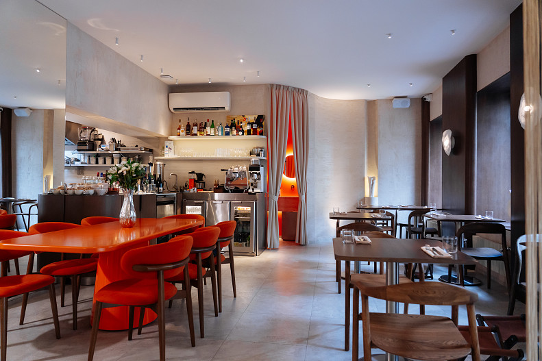 Интерьер — два небольших зала с открытой кухней, облицованной гималайским камнем, мандариновый стол для компании и светильники, будто из ракушечника. Посуда — арт-керамика, в деталях — отсылка к югу, который не привязан к стране, но читается в каждом штрихе.