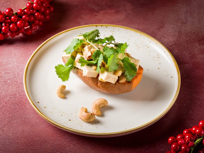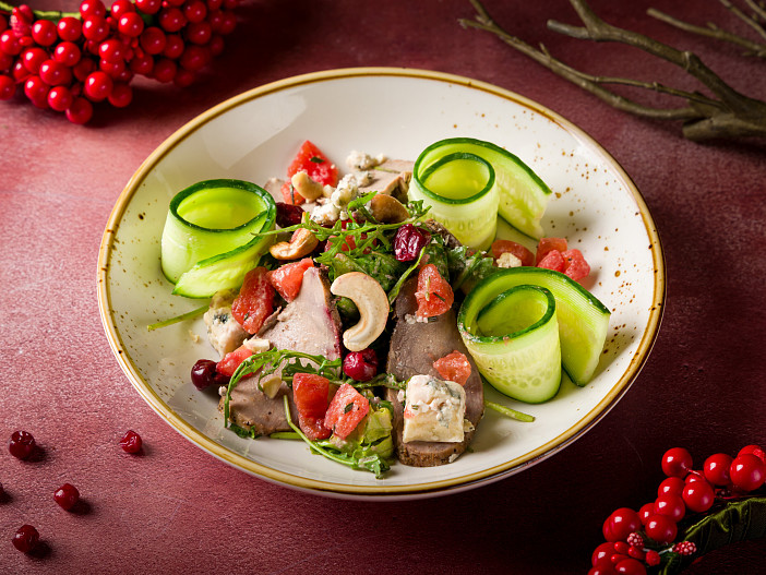 Для салата с утиной грудкой птицу шеф предварительно маринует с аджикой и тимьяном, а затем быстро обжаривает и миксует с горгонзолой, вишней и кешью. Салат с креветками шеф приправляет инжиром и тыквой, а печеный батат подает с кукурузой и тофу под ореховым соусом. Самая сочная закуска — лепешка роти со слабосоленым лососем, тыквой и вяленными томатами.