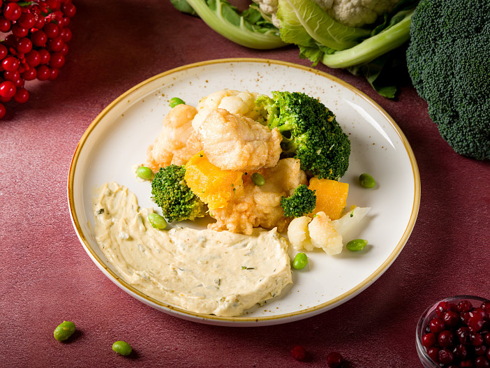Выбор горячего: долго томленые щечки под соусом «Вишнёвый демиглас» с тыквой, корнем сельдерея и морковью. Треска под соусом Беарнез подается с бланшированными брокколи и цветной капустой, со шпинатом и эдамаме.