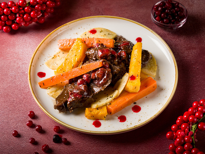 Роти с тыквой и лососем, печеный батат с кукурузой, замаринованная в аджике утиная грудка, щечки в вишневом демигласе — свежий взгляд от известного шефа на comfort food в новой кафе-кондитерской «Брусника».