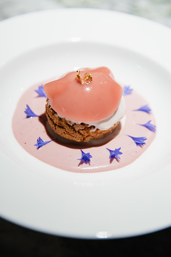 Эту линию продолжает десерт Maison EZZE, созданный шеф-кондитером Sartoria Lamberti Фатимой Салех. Нежное заварное тесто шу с хрустящим кракелином наполнено кремом с маскарпоне и ягодным конфи из клубники и малины. Сверху — тончайшая малиновая вуаль, похожая на легкую накидку, с акцентом из сусального золота. Подача — на соусе англез с добавлением каркаде и украшением васильками. Вкус, собранный так же точно, как кроится платье.