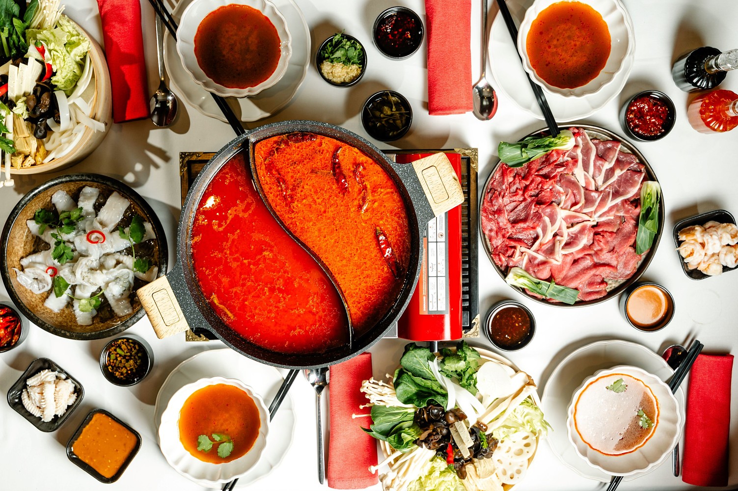 Вариация блюда от шеф-повара Чжана СяньЧэна максимально приближена эталону: на столе находится варочная поверхность, на которую устанавливается специальный котел с двумя отделениями, в каждое из которых заливают кипящий говяжий бульон: острый с приправами и перцем чили и томатный.
