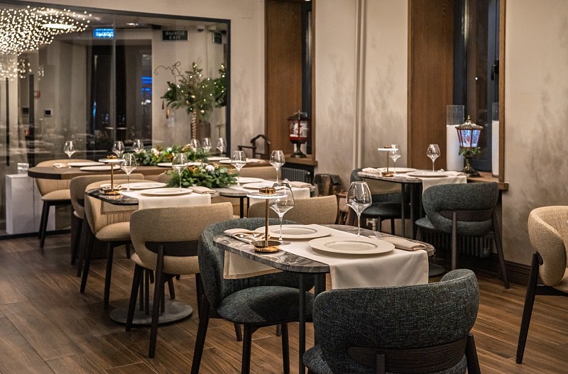 Пространство нового ресторана выполнено в современном классическом стиле и поделено на основной зал и уютную барную зону. В отделке используются натуральное дерево, итальянский мрамор и металлические рельефные панели, а барная стойка и вся мебель спроектированы дизайнерами и выполнены на заказ.