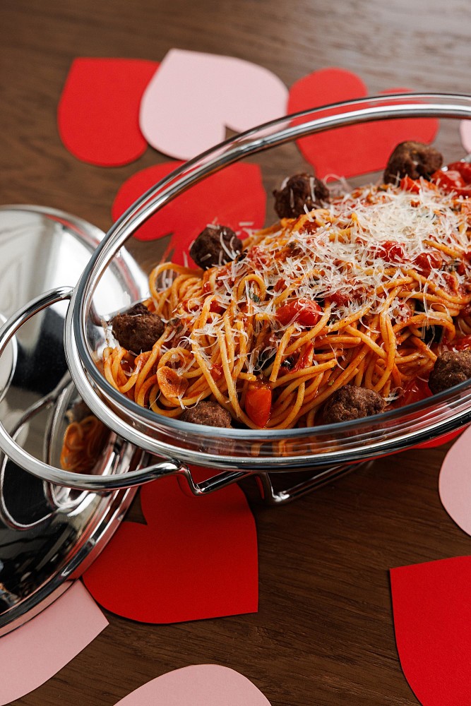 Специально к празднику шеф-повар Руслан Федотов воссоздал одну из самых трогательных сцен в истории кино, подготовив блюдо по мотивам знаменитого ужина из мультфильма «Леди и Бродяга». Главным героем вечера станут спагетти на двоих, приготовленные в лучших традициях comfort food. Густой томатный соус с ароматом пряных трав и сочные мясные фрикадельки превращают знакомое блюдо в настоящий символ близости и разделенного момента на двоих.