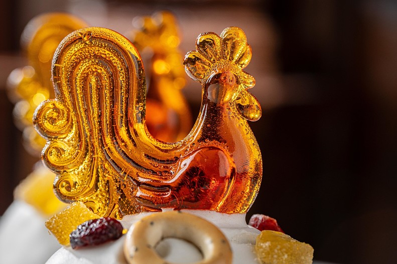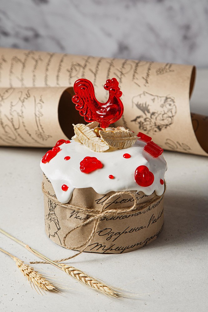 В образе этого кулича отразился светлый праздник весны. Матовая белая глазурь плотной шапкой покрывает кулич, а на ней расположился леденец-петушок, отсылающий к детству и народным мотивам, которые сегодня переживают второе рождение в гастрономии. Кулич представлен в двух версиях. В первой вокруг петушка рассыпались изящные перья, те самые, которыми писали два века назад. Во второй рядом с петушком непринужденно расположились желтые подсолнухи.