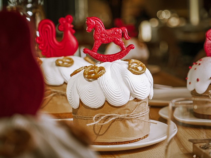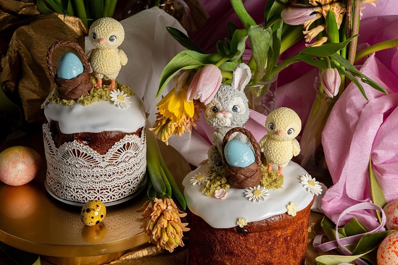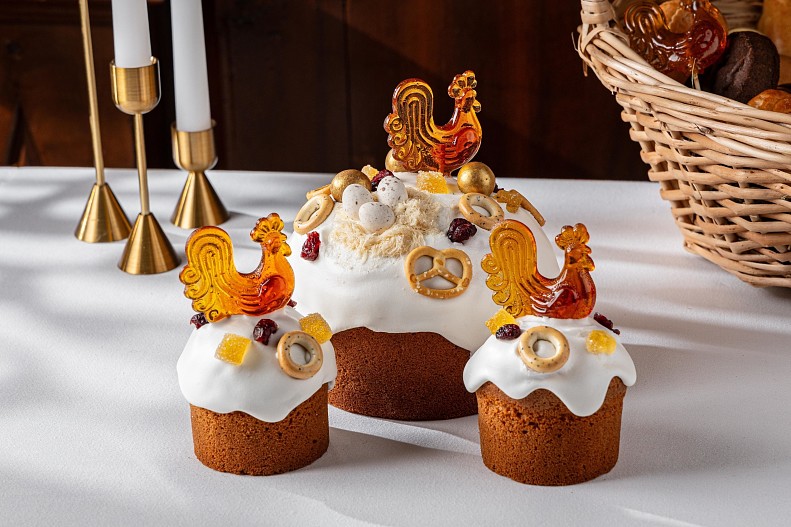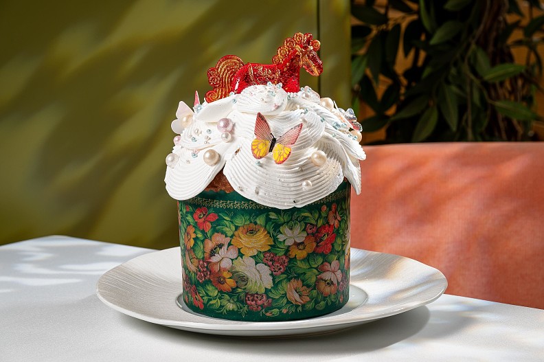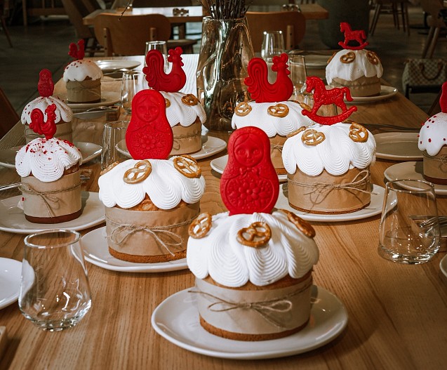 Сдобные куличи на долгой опаре с кремовыми начинками и славянским декором: петушки, лошадки, матрешки — в ресторане «Альма» в Раменках выпекают красавцы-куличи.