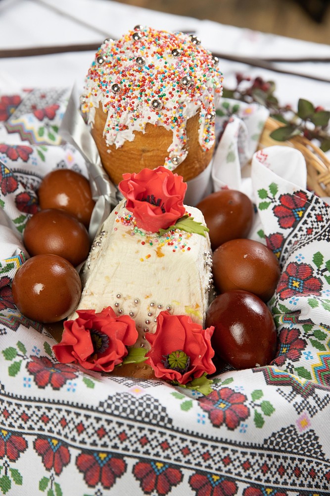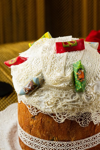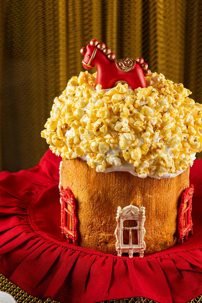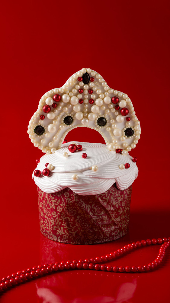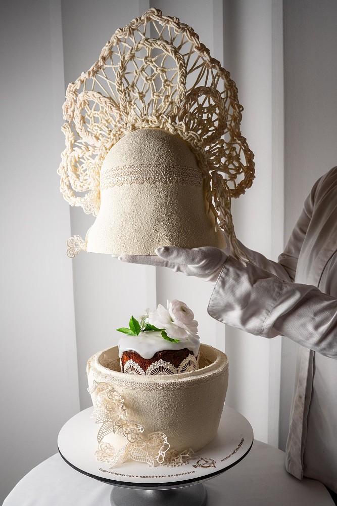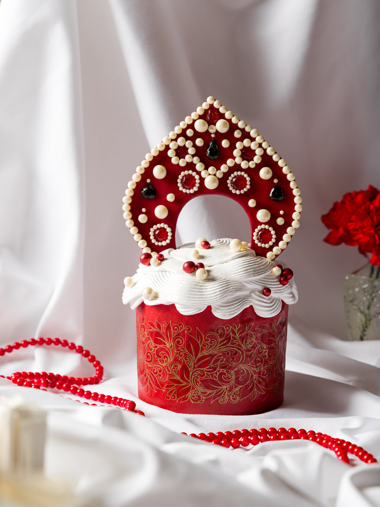 Куличи с тремя разными кокошниками не менее роскошны. Шеф-кондитер Дарья Терешонок-Кожуховская выступила в роли дизайнера и создала яркий декор женских головных уборов. Каждая деталь кокошника — съедобная: мастика, шоколад и мармелад.