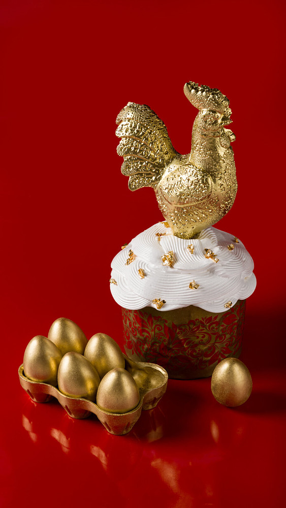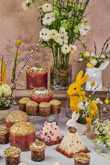 Кулич с золотым петушком и золотые шоколадные яйца, творожная пасха в стиле Ламбет и куличи с коллекцией кокошников — Пасха в гранд-кафе «Dr. Живаго» одна из самых нарядных в Москве.