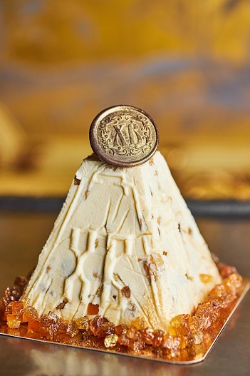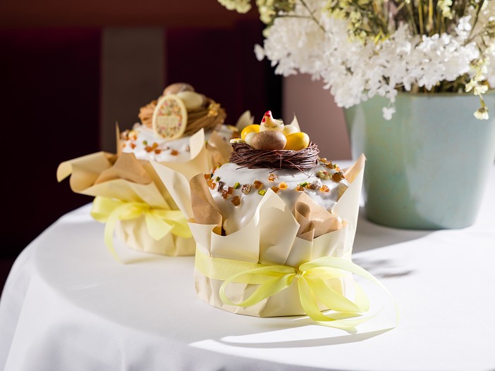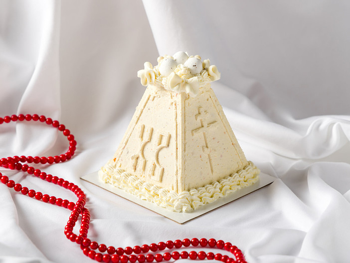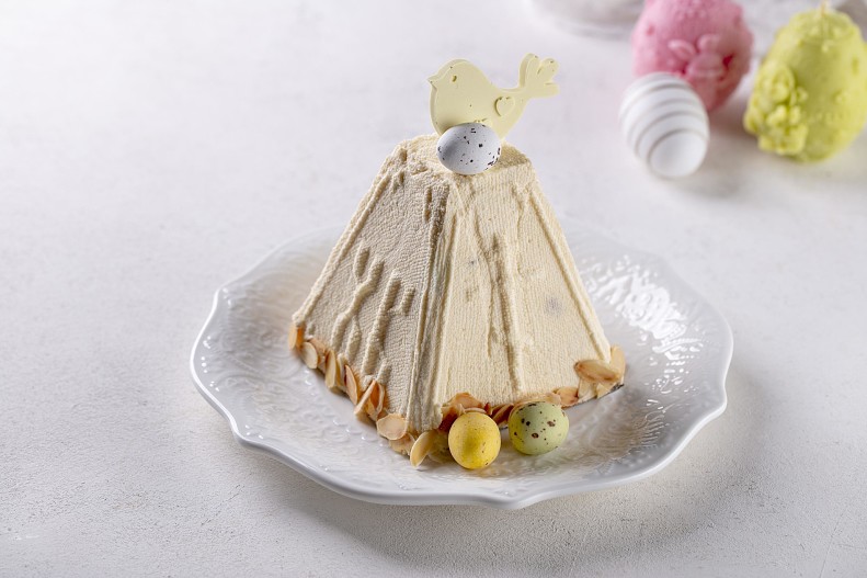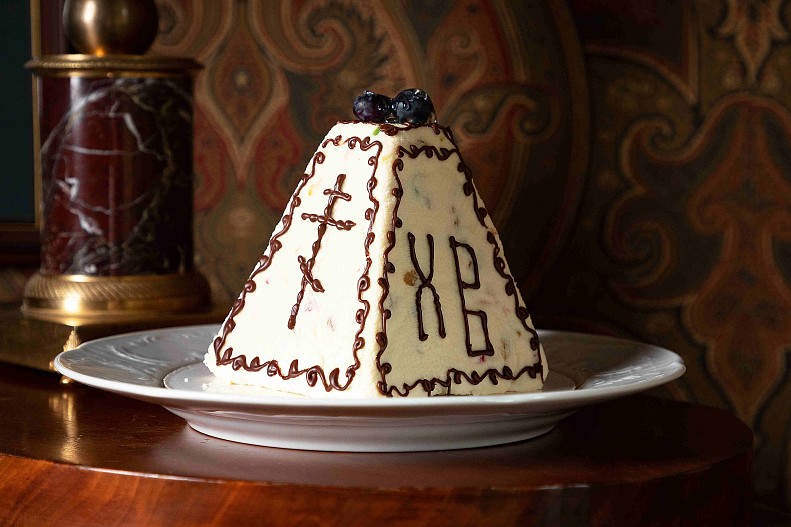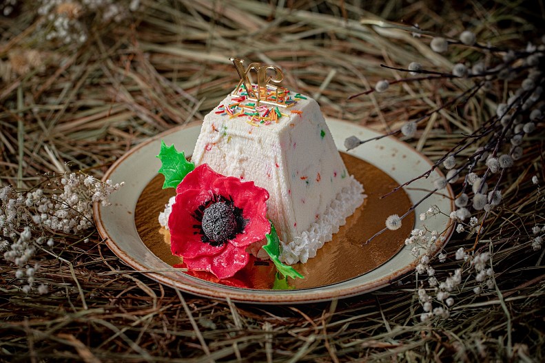Нежное угощение, являющееся одним из главных символов торжества, отличается деликатной текстурой и сбалансированным вкусом. В основе — отборный фермерский творог, дополненный апельсиновыми цукатами и миндалем. Десерт подается с изящной шоколадной птичкой и шоколадными яйцами.