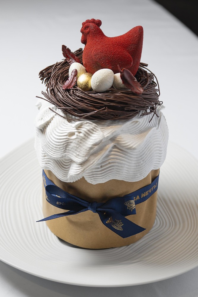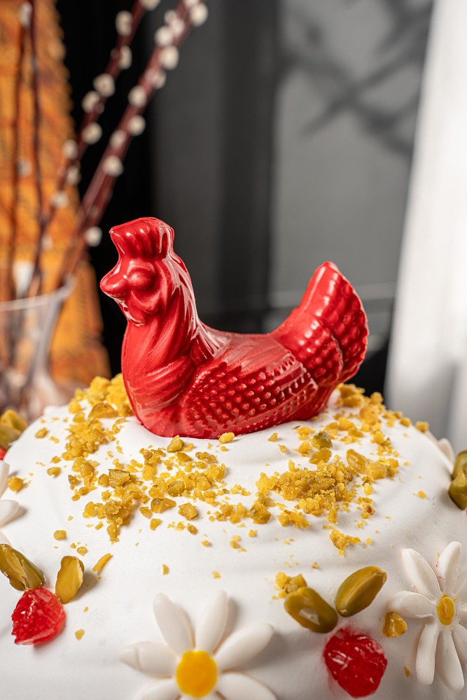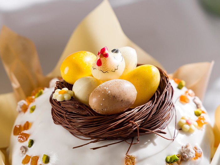 В панеттоне добавляют домашние апельсиновые и лимонные цукаты, янтарный изюм и курагу. В завершение его покрывают той же лимонной глазурью, эффектно уложенной волнами, и декорируют шоколадным гнездом с красной курочкой из темного шоколада, белыми и золотыми «яйцами» и воздушными «перышками».