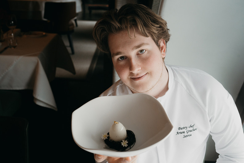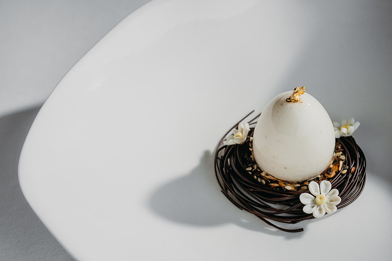 Пасхальную историю продолжает десерт от шеф-кондитера SAVVA Артёма Грачева — яйцо из кокосового мусса с начинкой из маракуйи. При разрезании она мягко вытекает, напоминая желток, а сам десерт подается на хрустящей граноле с шоколадными элементами и украшен цветами из сахарной пасты и золотом.