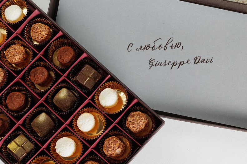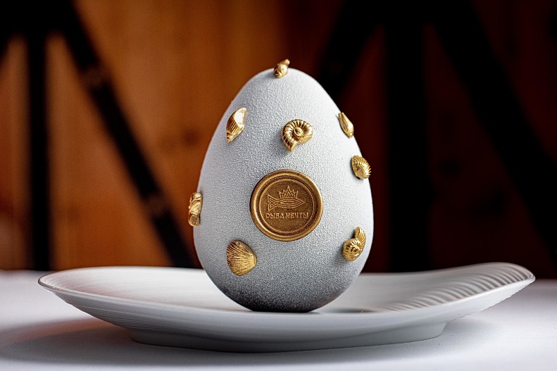 Отдельное место в праздничной коллекции занимают фигурные яйца из темного шоколада: белые и красные, с бархатным велюровым покрытием, декорированные золотыми медальонами в виде рыбок и ракушек. Каждое яйцо — своего рода шкатулка с драгоценностями. Внутри — особая «начинка»: молочная конфета с воздушным рисом, карамельная с вафельной крошкой и пеканом, саблированный фундук и драже из арахиса в молочном шоколаде.