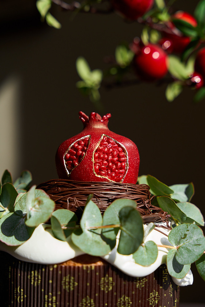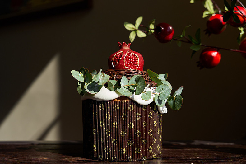 Гранат, как один из главных символов Турции и Стамбула, очень подходит праздничной московской выпечке. Немного гранатового сока шеф-кондитер ресторана Levantine Денис Комляков добавляет и в сдобное тесто для кулича — для легкой терпкости. А мастерским изготовленным шоколадным гранатом декорирует изделие.