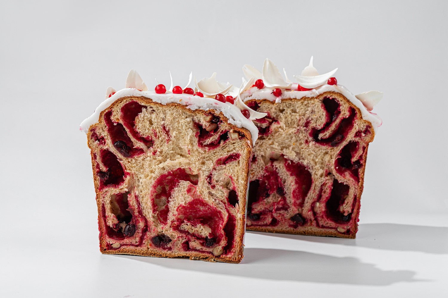 Второй вариант — слоеный ягодный кулич с более легким и ярким вкусом. В качестве начинки — малиновый марципан, дробленый миндаль и клюква, создающие гармоничное сочетание сладости и легкой кислинки. Кулич украшен белоснежной помадкой, шоколадными лепестками и ягодами клюквы.