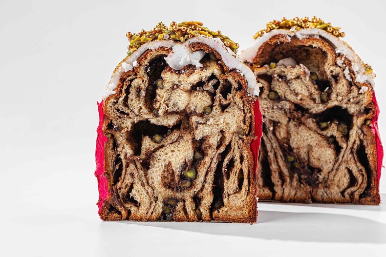 К светлому празднику бренд-шеф ресторана SAVVA Андрей Шмаков вместе с Гленом Баллисом и Томом Халпиным и шеф-кондитером LIMBO Юлией Джафаровой создали фирменный панеттоне, который легко станет центром семейного стола. Воздушный, с насыщенным ароматом, он приготовлен на живой итальянской закваске Levito madre и проходит длительную ферментацию, благодаря которой тесто получается особенно мягким. Внутри — апельсиновые цукаты и темный бельгийский шоколад, снаружи — хрустящая миндально-шоколадная глазурь и лепестки миндаля.
