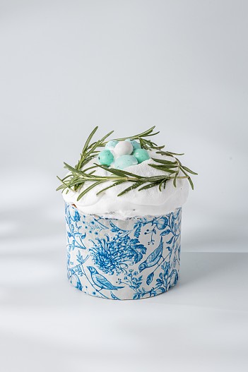 Ароматный кулич приготовлен из кексового творожного теста с цукатами апельсина, вишни и кумквата, изюмом и курагой. Декорирован кулич пышной шапкой лимонной глазури и шоколадным гнездом с «яйцами» и тонкими «перьями» из темного шоколада.