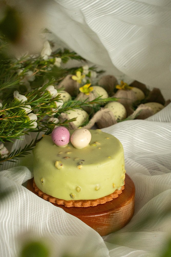 Творожная пасха фисташка–вишня — творожная пасха на хрустящей песочной основе с вишневой начинкой, покрытая фисташково-шоколадной глазурью.