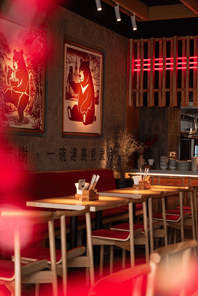 Символом концепции не случайно стал медведь-камуи, дух‑защитник и хозяин леса из мифов народов северной Японии — сильный, выносливый, приносящий удачу. Он транслирует идею умиротворения и стабильности — ясная концепция, неизменно высокое качество, внимание к деталям. Кстати, в форме маскота бренда в Ramen Room готовят фирменный десерт — из воздушного мусса, покрытого хрустящей алой глазурью.