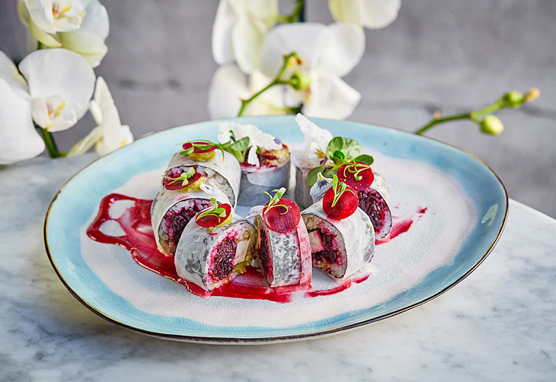 Сверху выложить начинку – луково-свекольный джем, пюре авокадо, сыр тофу, дайкон и свеклу. Скрутить ролл и нарезать на кусочки. Перед подачей украсить кресс-салатом.