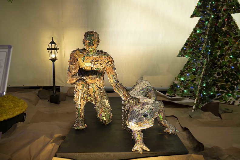 Украшения из вилок и кинопленки, розовый слон из шин, портрет Пушкина из журналов и портрет Стива Джобса из микросхем, «железненький» цветочек из шестеренок, коробки передач японского мотоцикла и болтов, стул молодого йога из старых гвоздей, диван из мягких игрушек — это лишь малая часть экспонатов, представленных в музее. В своих работах авторы используют то, что годами лежало бы на свалке, загрязняя окружающую среду. В «Доме интеллигентного бомжа» можно посидеть на диване из старых чемоданов или из картонных гофр для яиц.