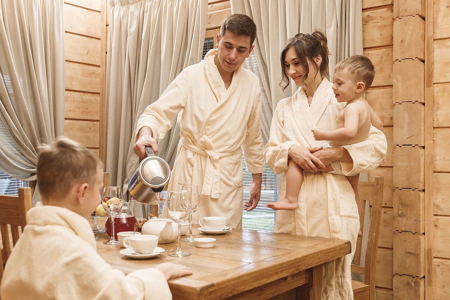 Если на отдых вы любите выезжать большой компанией, то для размещения лучше выбрать коттедж Grand Family Suite площадью 135 кв.м. Он имеет четыре спальни, просторную гостиную с обеденной зоной, две ванные комнаты и кухонную зону, террасу и собственный двор с качелями. Во дворе коттеджа расположена приватная зона с барбекю и мангалом, где гости могут самостоятельно приготовить мясо или свежепойманную рыбу.