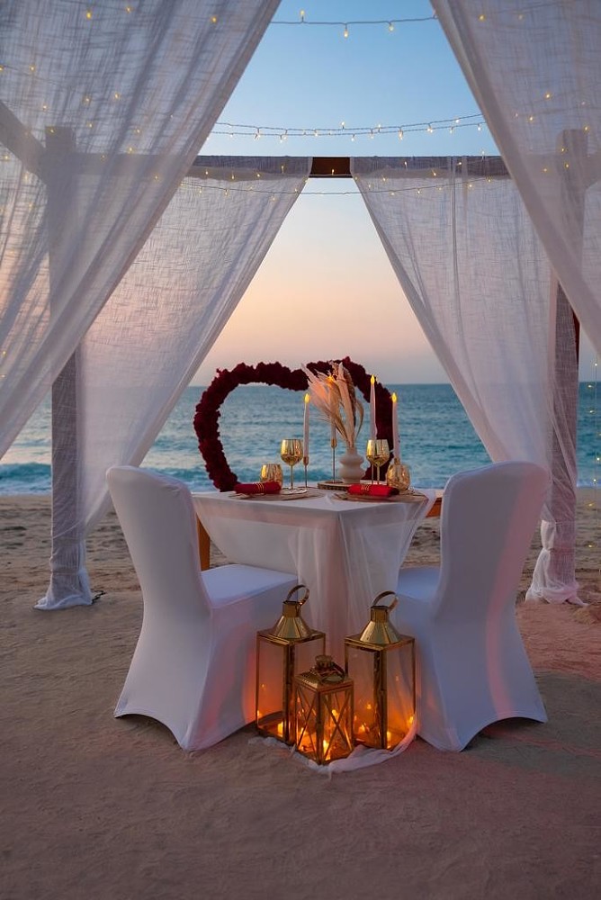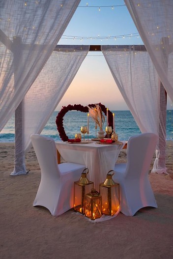 Романтический ужин для двоих будет подан на пляже на берегу моря под сводами шатра, создающего ощущение полного уединения. Прекрасное меню ужина будет включать изысканные блюда из даров моря и земли и доставит гостям незабываемые гастрономические удовольствия.