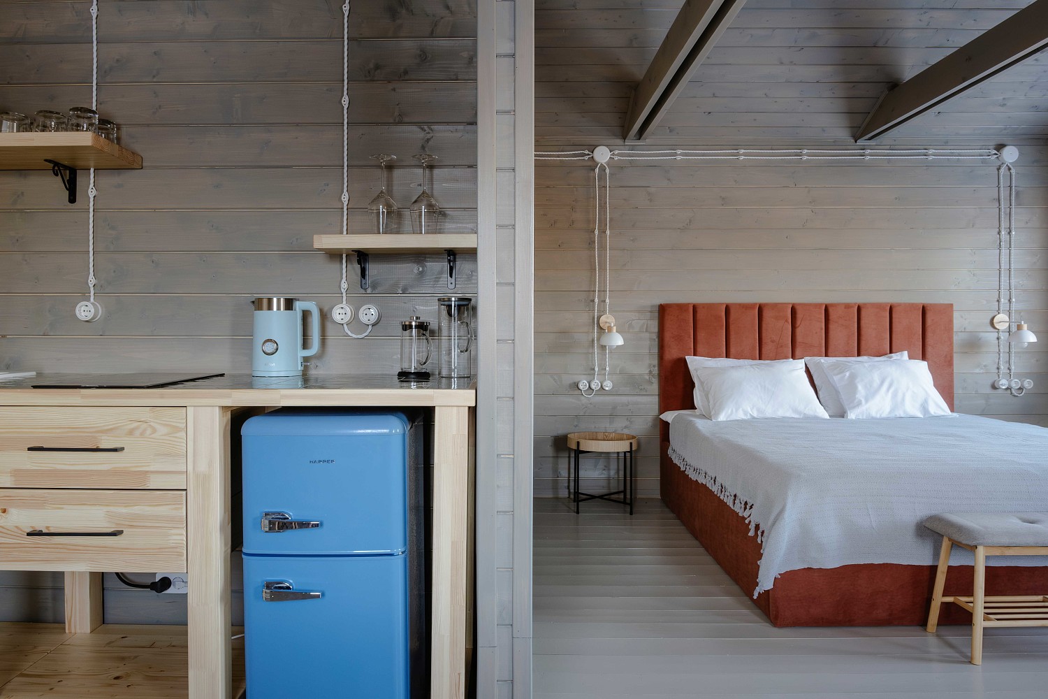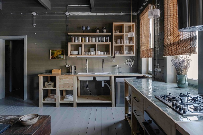 Пространство гостевого дома любовно создали резиденты Тарусы — дизайнер интерьеров Анастасия Монастырева и гастроэнтузиаст Дмитрий Паршин. Они использовали в оформлении антикварную мебель, сундуки и декор работы местных мастеров в сочетании с современной техникой для комфорта гостей. Оформленный в натуральных тонах интерьер создает атмосферу спокойствия и размеренности. Выполненные вручную уникальные детали, такие как нарды с эклектичной росписью по дереву, вязаный плед, искусно выполненный автором проекта Анастасией, и декоративная деревянная собачка по имени Шарик, создают уют и настраивают на теплое общение с близкими.