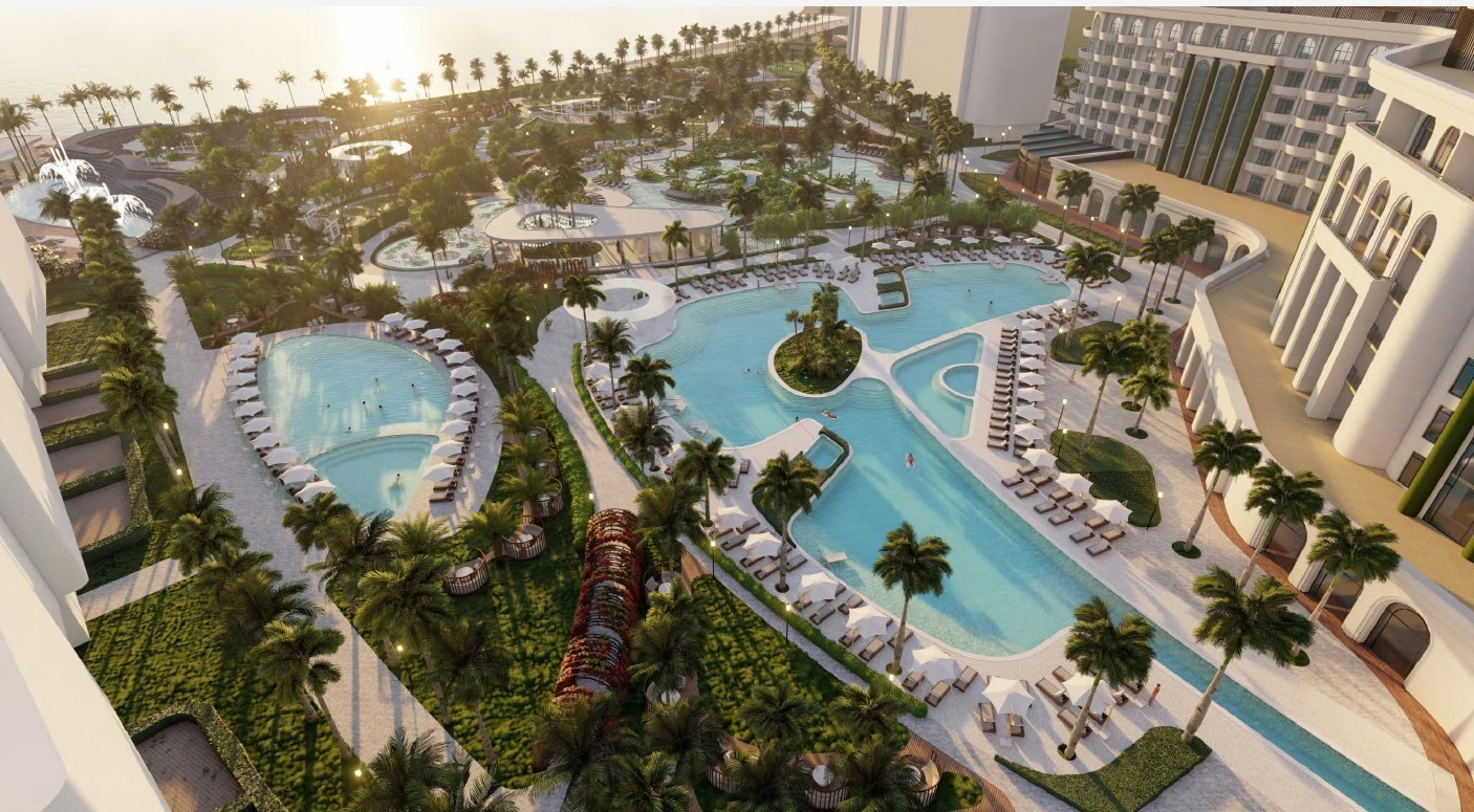 Атмосферу мирового морского курорта создает выдающееся по площади зеркало воды комплекса: 11 бассейнов, 8 из которых с чистейшей морской водой из глубин акватории Черного моря. Система водозабора с учетом глубины и удаленности водозабора беспрецедентна и воплощена в гостиничном проекте впервые в России.