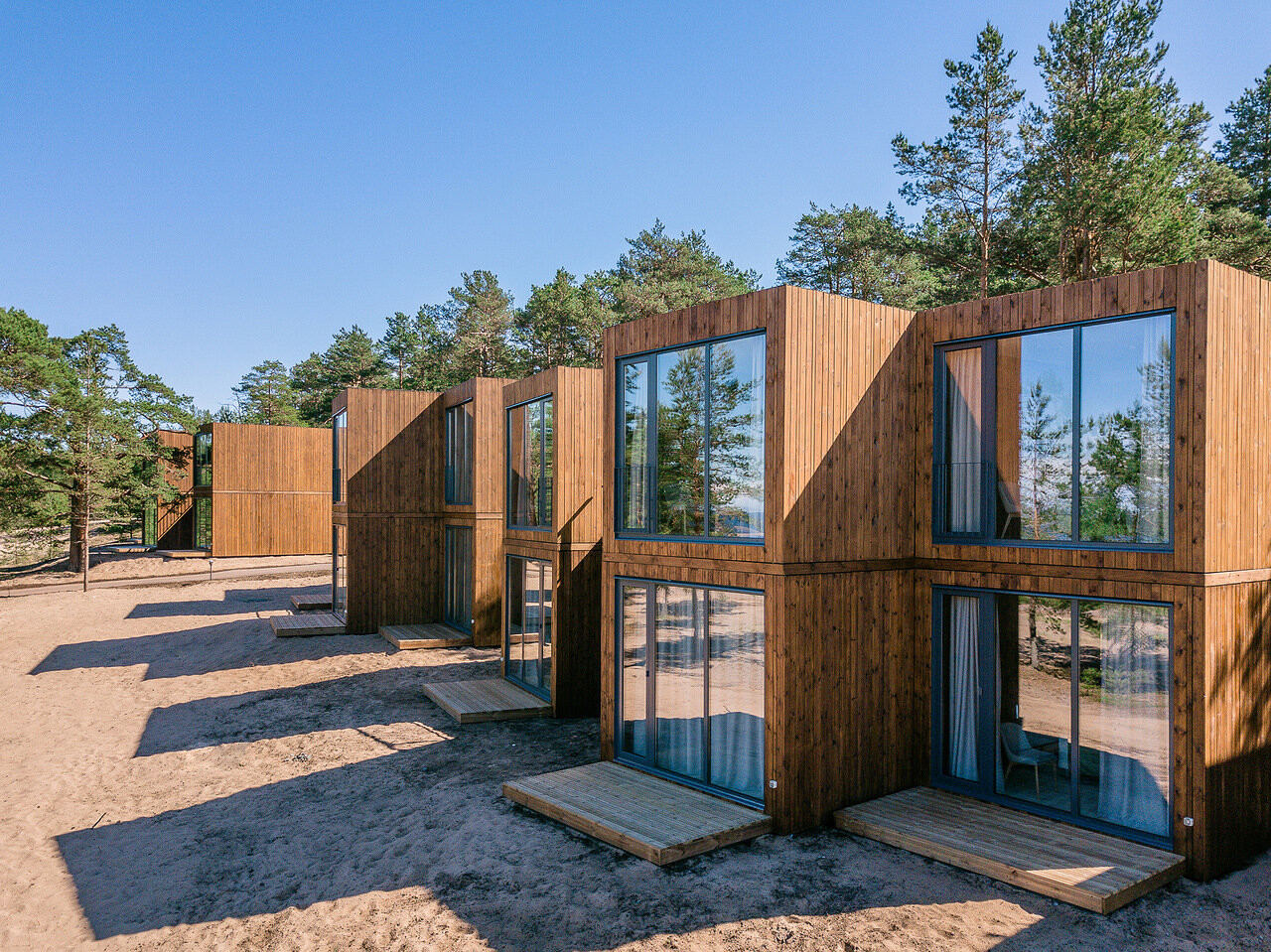 «Точка на карте. Приозерск» расположен на мысе Маячный в Ленинградской области. Из каждого номера открывается вид на берег и реку Вуоксу, а индивидуальный вход создает ощущение приватности. На территории отеля — ресторан, винная гостиная, веревочный парк с трассами разной сложности и уединенная панорамная баня в сосновом бору. Для индивидуальных гостей действует акция: до конца апреля дети до 12 лет отдыхают бесплатно, если заезжают с двумя взрослыми в номера-студии, а завтраки уже включены в стоимость.
