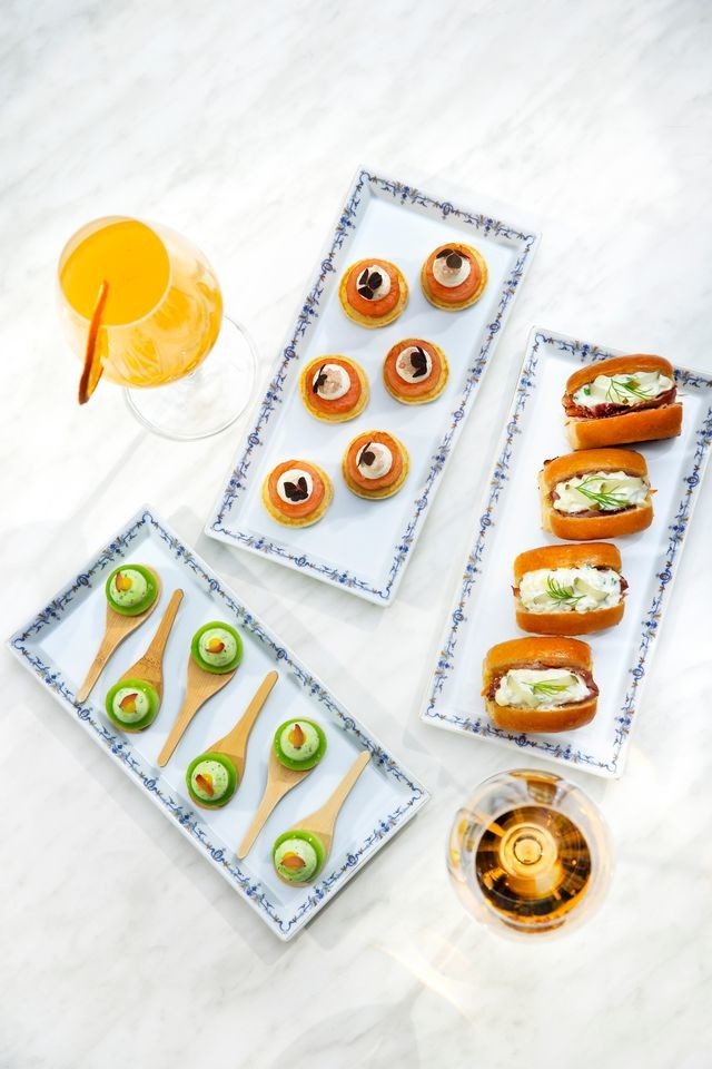 К коктейлям предлагаются изысканные закуски тапас: блины с копчёным лососем и икрой юдзу, огуречный тзатзики с маринованным ревенем и бриошь с пастрами. Сладкоежкам понравятся фруктовые десерты: томлёный персик с красной смородиной, вербеной и хрустящими вафлями, и клубника с малиной и кремом шантильи.