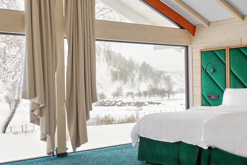 Гости, которые ищут на Алтае глубокого единения с природой, могут выбрать одно из 26 шале прямо на территории маральника. Отсюда открывается возможность наблюдать за жизнью маралов в естественной среде, а тишина способствует полному расслаблению. Гостям предоставляется отдельный ресепшн и ресторан с фермерскими завтраками. Для прогулок доступны эко-тропа длиной 2700 метров, фермерский магазин, контактный зоопарк и храм святого Владимира. Добраться до шале гостям помогают гольф-кары и миниатюрные японские автомобили, передвигающиеся по территории курорта практически бесшумно, сохраняя атмосферу спокойствия.