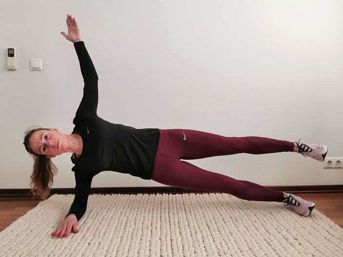 Встаньте на правое предплечье и правое колено так, чтобы локоть был под плечом. Отталкивайтесь локтем от пола, напрягайте пресс, подкручивать таз, не прогибайте поясницу. Удерживайте это положение по 45-60 секунд на каждую сторону.