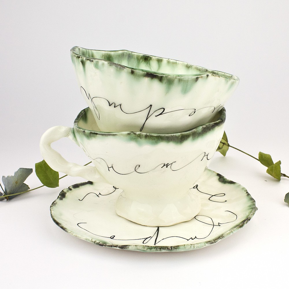Чайная пара «Нежное утро» из тончайшего фаянса украсит любой стол и станет неотъемлемым атрибутом душевной беседы с самыми близкими за утренней трапезой. Серия выполнена в сочетании акварельных подтеков на белоснежных поверхностях с экспрессивными каллиграфическими строками, выполненными надглазурной росписью пером, российским дизайнером Еленой Алексеевой.