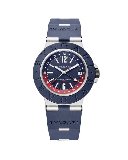 Часы BVLGARI Aluminium GMT, механизм с автоматическим заводом, индикация времени второго часового пояса в 24-часовом формате, корпус из алюминия, диаметр 40 мм, безель из синего каучука с гравировкой в виде двойного логотипа, синий циферблат, часовые метки и стрелки с люминесцентным покрытием, крышка корпуса из титана, крепления из алюминия, браслет из синего каучука.