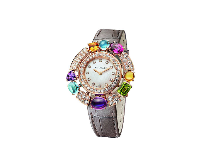 Часы категории высокого ювелирного искусства Allegra, корпус из белого золота 18 карат, бриллианты классической огранки, два цитрина, аметист, перидот, два голубых топаза, два родолита, перламутровый циферблат, бриллиантовые часовые метки, ремешок из кожи аллигатора синего цвета.