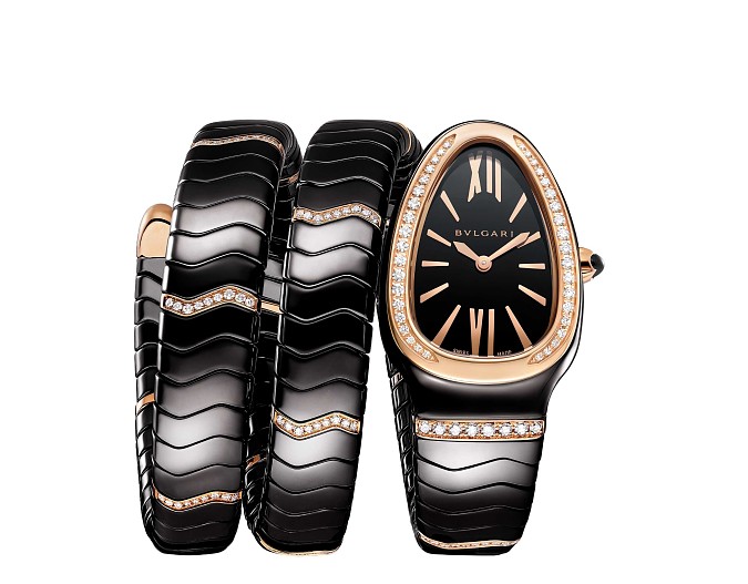 Часы Serpenti Spiga в два витка, черная керамика, безель из розового золота 18 карат, элементы с бриллиантами, черный циферблат. Водонепроницаемость до 30 метров.