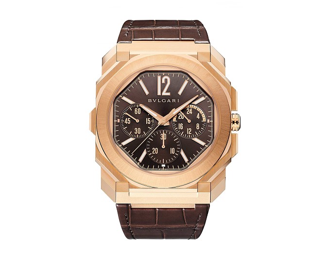 Часы Octo Finissimo Chronograph GMT, ультратонкий мануфактурный механизм (толщина 3,30 мм) с автоматическим заводом. Корпус 43 мм из розового золота 18 карат с сатинированными и полированными поверхностями. Коричневый лакированный циферблат с отделкой «солнечные лучи», ремешок коричневого цвета из кожи аллигатора.