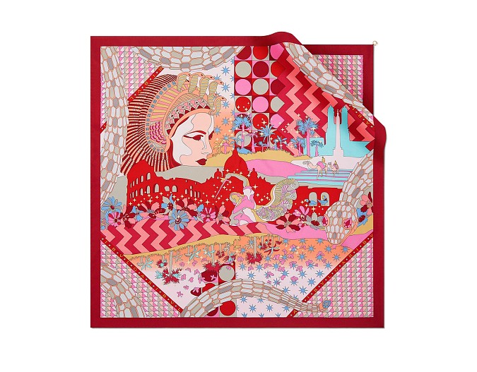 Платок Enchanted City из тонкой шелковой саржи красного цвета оттенка малинового граната с принтом и металлической подвеской BULGARI BULGARI – это приглашение в сказочный мир, где креативные интерпретации самых эмблематичных ювелирных творений Bulgari переплетаются со знаменитыми достопримечательностями Рима и великолепной Клеопатрой. Одновременно классическую и современную модель можно носить самыми разными способами: повязав на шее в знаковом стиле, на талии как эффектный пояс, а также в качестве модного аксессуара для волос или украшения для сумки. 90 x 90 см. Изготовлено вручную в Италии.