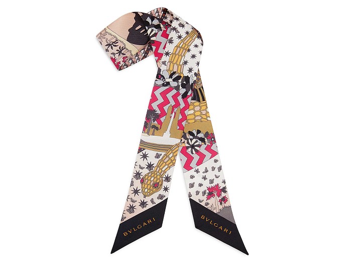 Узкий мини-шарф Enchanted City из тонкой шелковой саржи черного цвета с принтом – это приглашение в сказочный мир, где креативные интерпретации самых эмблематичных ювелирных творений Bulgari переплетаются со знаменитыми достопримечательностями Рима и великолепной Клеопатрой. Эту универсальную модель можно носить самыми разными способами: повязав на шее или на запястье, в качестве аксессуара для волос, закрепив на ручке сумки или обернув вокруг тульи шляпы. 5 x 85 см. Изготовлено вручную в Италии.