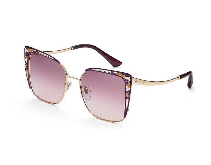 Солнцезащитные очки Serpenti «Colorhapsody» в квадратной металлической оправе дополнены фиолетовыми линзами. Модель украшена микроузором из эмали, напоминающим калейдоскопический эффект.