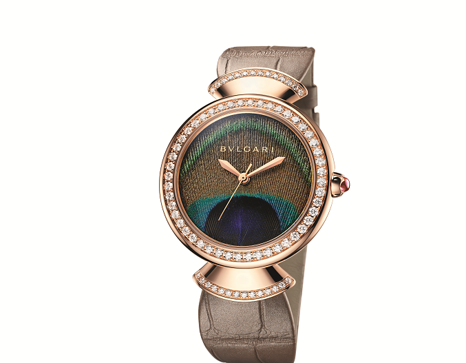 Часы DIVAS' DREAM, мануфактурный механизм с автоматическим заводом, корпус из розового золота 18 карат, безель и крепления в форме веера из розового золота 18 карат с бриллиантами классической огранки, циферблат с настоящим пером павлина, ремешок из блестящей кожи аллигатора бежевого цвета.