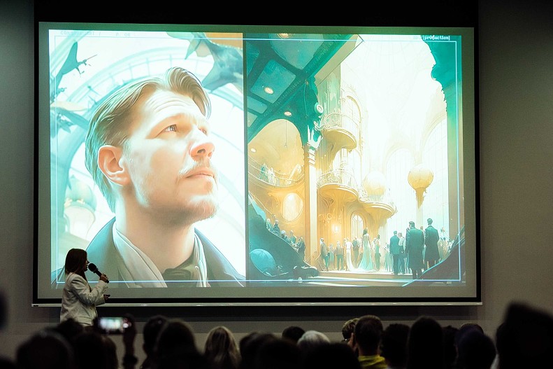 Режиссер и продюсер Роман Новиков показал практические примеры того, какие инновационные решения он использует для пост-продакшна – персонажи анимации, сцены, созданные в комбинации работы специалиста и нейросетей: «Мы все здесь немного проповедники, потому что хотим, чтобы вы этим пользовались. В индустрии есть проблема – мало кто использует профессиональный софт. У нас до сих пор много кустарных решений и очень тяжело внедрить новые технологии. Нам кажется, что все алгоритмы и ИИ где-то там далеко и сложно. Но это всё рядом – у нас есть классные специалисты!».