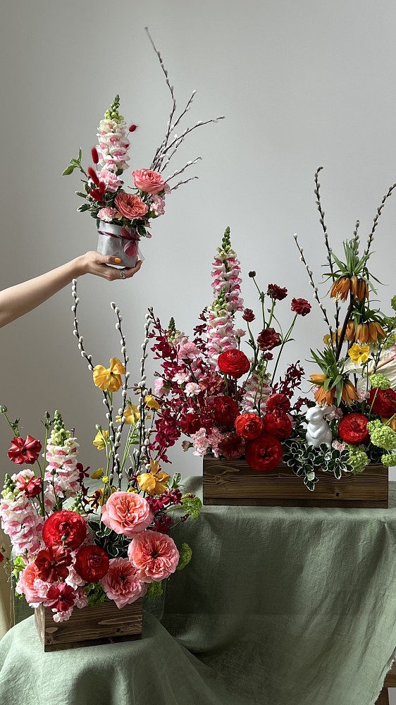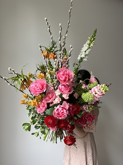 Сет для яркого праздника. Насыщенная гамма, в которой сочетаются фритиллярия императорская, сезонные пионы, антирринум, ветки вербы, ранункулюсы нескольких сортов, орхидея, кустовые диантусы.