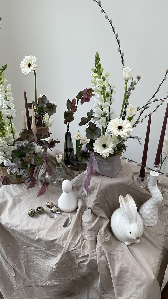 Фловерна в своей коллекции сочетает символичную для праздника вербу со стильными сезонными цветами, фарфоровыми зайчиками, стеклянными шарами с перьями или в форме пасхального яйца.