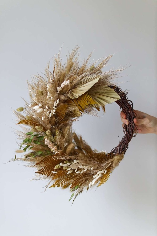 Ассиметричные интерьерные венки из сухотравов или солнечной мимозы.