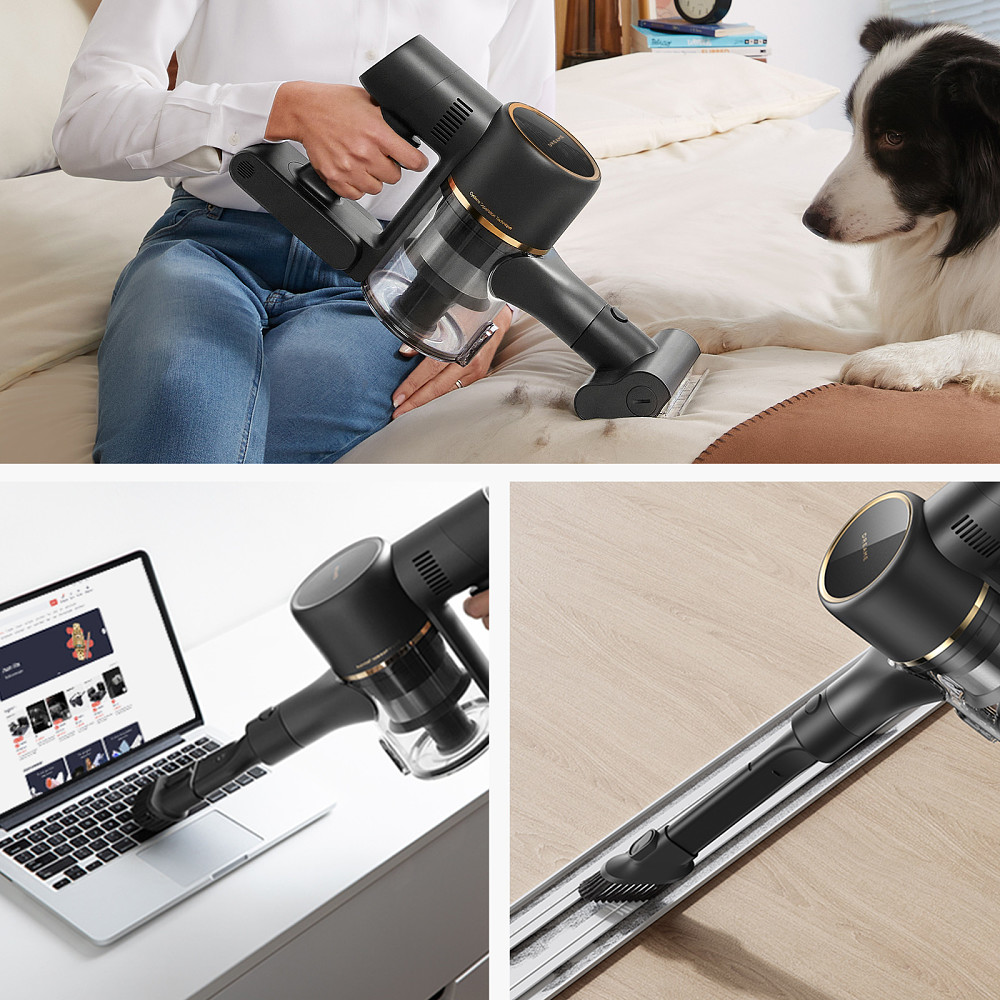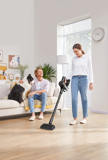 У моющего пылесоса — специальная щетка spin mop, которая отлично подходит для влажной уборки: насадка позволяет совмещать уборку пылесосом и мытье полов, что позволяет бороться со стойкими пятнами, с которыми не может справиться обычный пылесос: кухонный жир, следы домашних животных, пятна от кофе и чая. Дополнительно девайс оснащен небольшой насадкой для чистки предметов мебели: диванов, кресел и подушек, а также щеткой для нескольких поверхностей, которая позволяет без труда очищать не только полы, но и ковры с высоким ворсом, не прилагая для этого особых усилий. Новая система очистки: многоконусная система фильтрации. Благодаря этой технологии пылесос удаляет не только видимый мусор, но и эффективно борется с пылью и мельчайшими частицами диаметром до 0,3 мкм. Высокоскоростной бесщеточный двигатель, мощностью 150 AW, обеспечивает более эффективную очистку с увеличением мощности, аккумулятор емкостью 8 x 2500 мАч обеспечивает 90 минут беспроводной уборки.