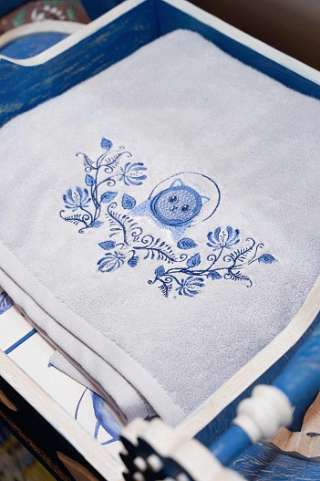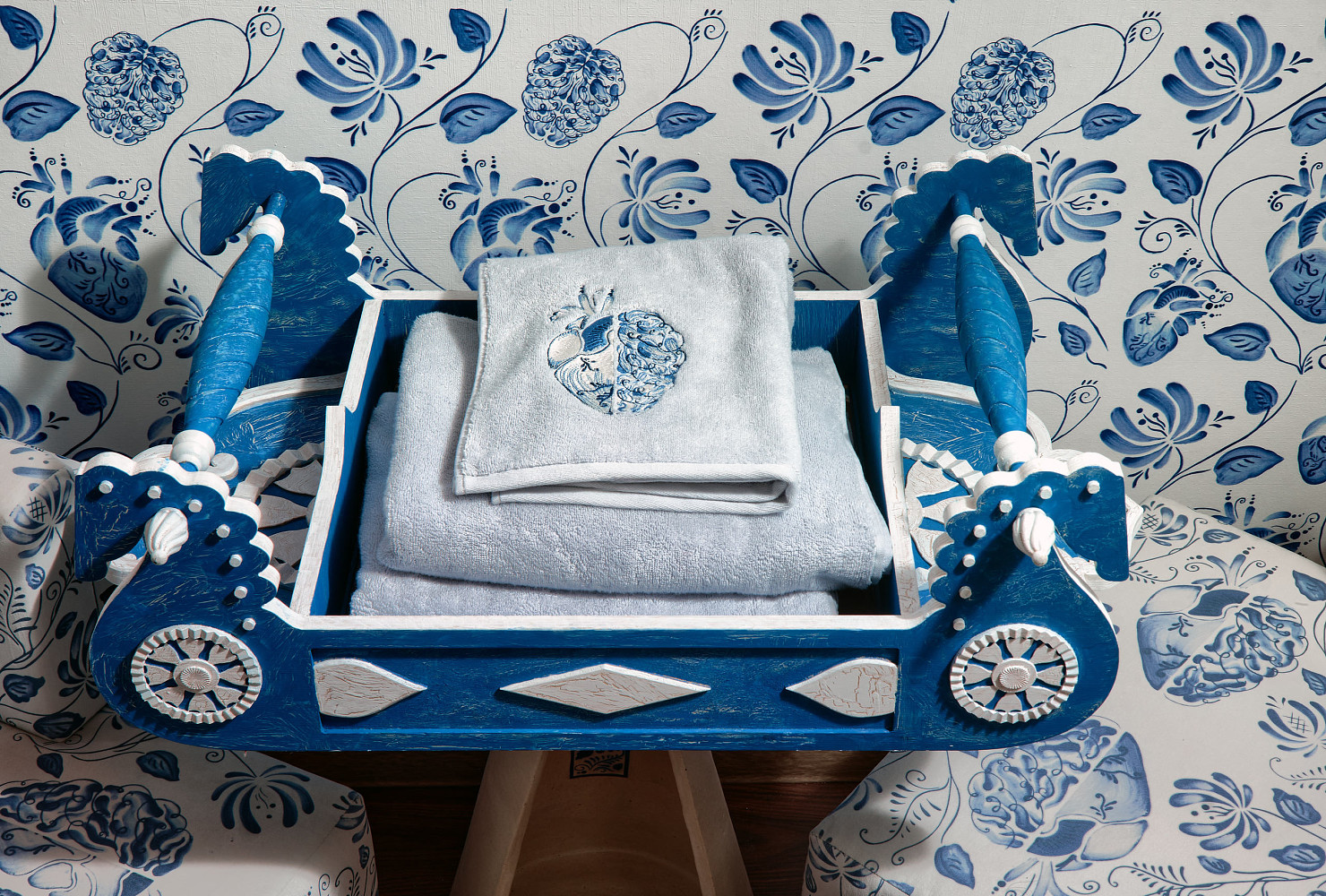 «Синий русский» – авторский принт, в котором в одну картинку, расписанную под гжель, сливаются философские и религиозные символы с элементами поп-культуры. Так, на полотенце в едва заметном синеватом оттенке оказывается уже полюбившийся персонаж – улыбчивый котик в цветах. На другом – сразу два органа, соединяющиеся ровно посередине, – сердце и мозг.