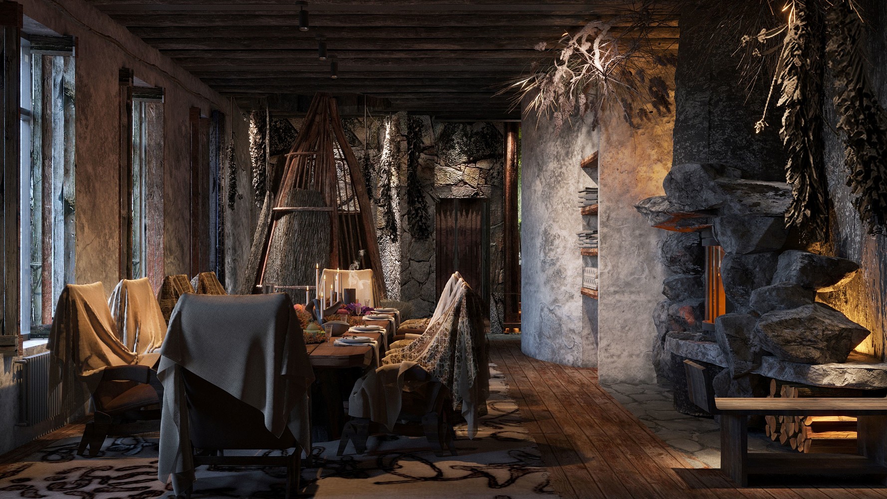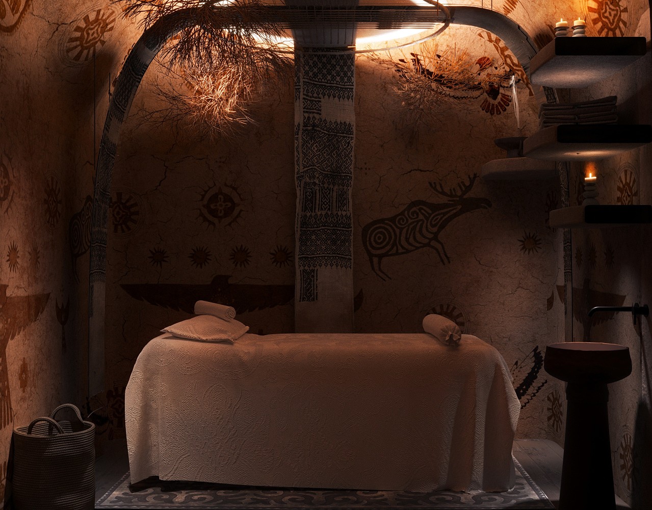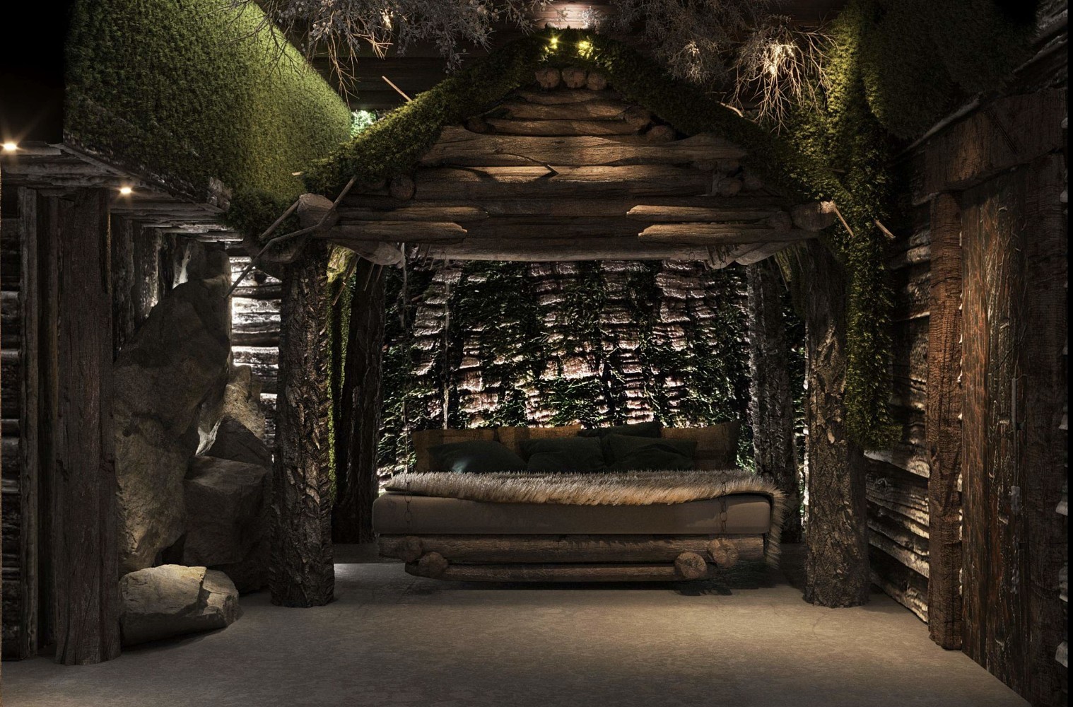 Берлога — пространство, наполненное духом зимней тайги. Сочетание зелени, природного камня, дерева, ароматов кедра и пихты, легкой туманной дымки создает ощущение, что вы находитесь в тайге — самом большом и величественном биоме.