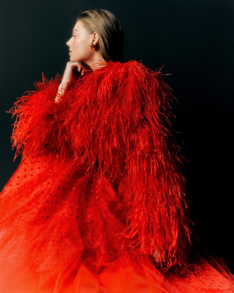 Этот жакет автоматически станет главным акцентом любого образа. Благодаря своему насыщенному цвету, фасону и воздушным перьям, изделие будет привлекать взгляд каждого.